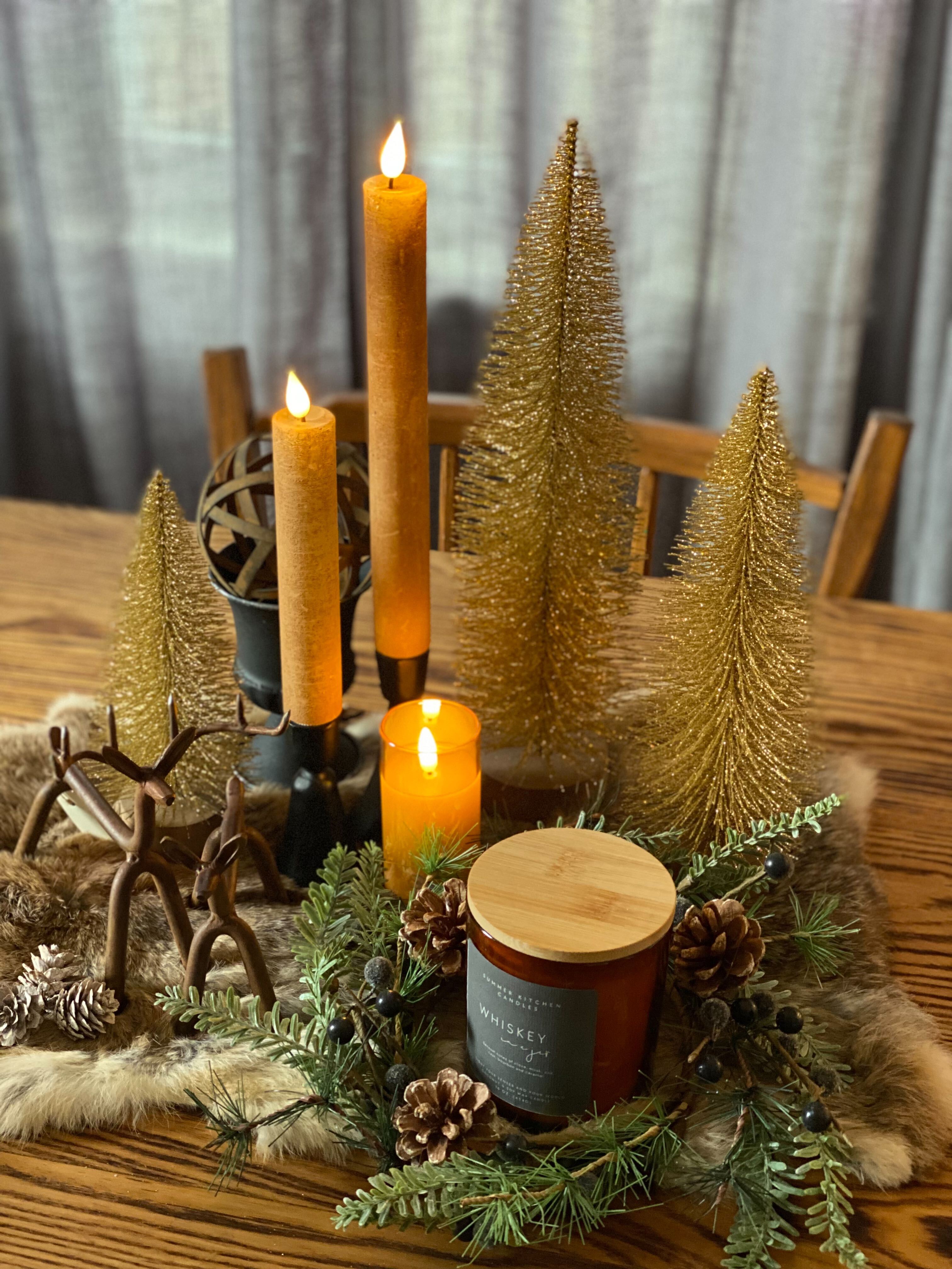 This table setting is perfect for those who like to combine golds, naturals, rusty, metal, fur, sparkle, blacks and greens. A complete table setting, perfect for all winter long. Let me help you make your home the envy of all. This complete ensemble will be packed and ready for you to set up and display in your home this winter!