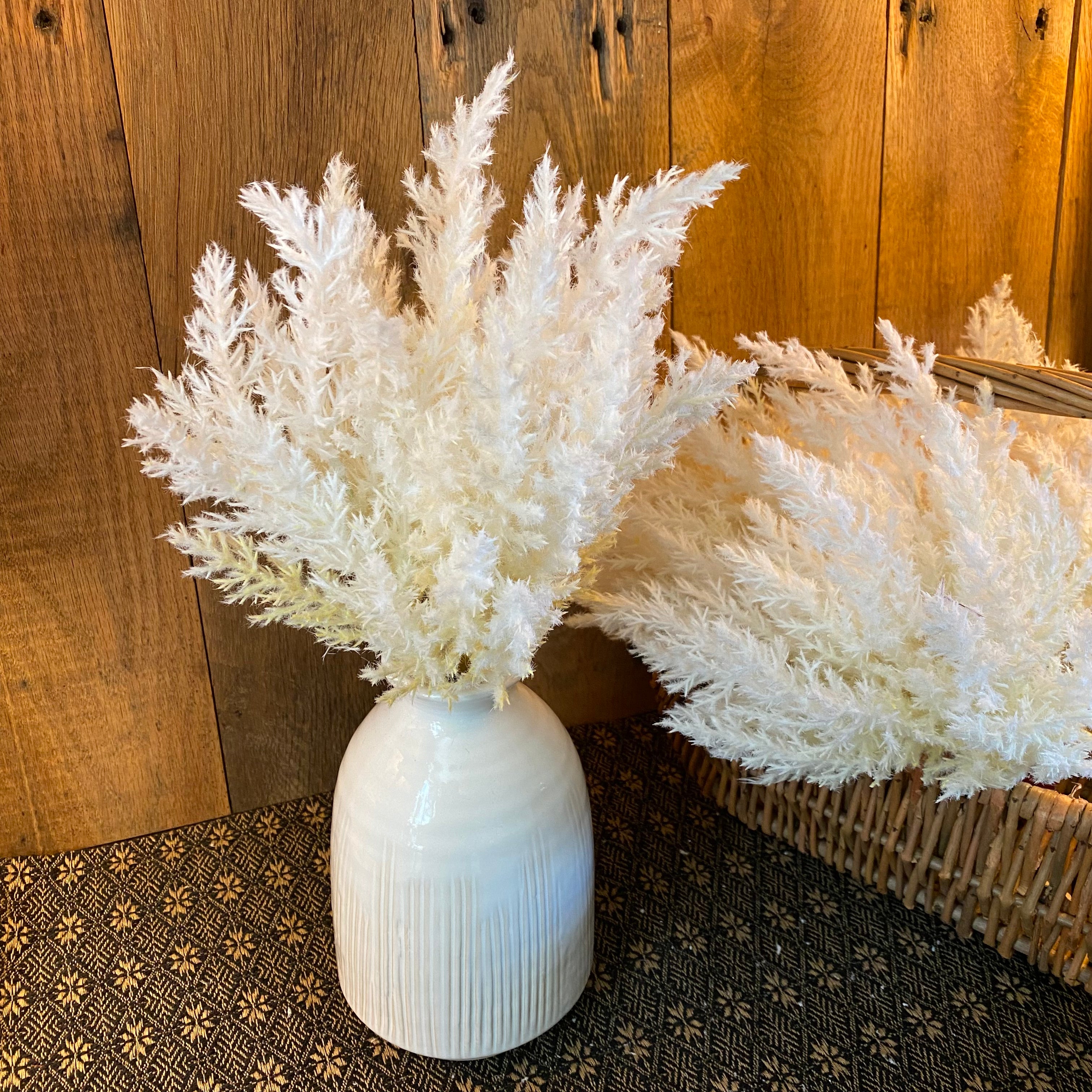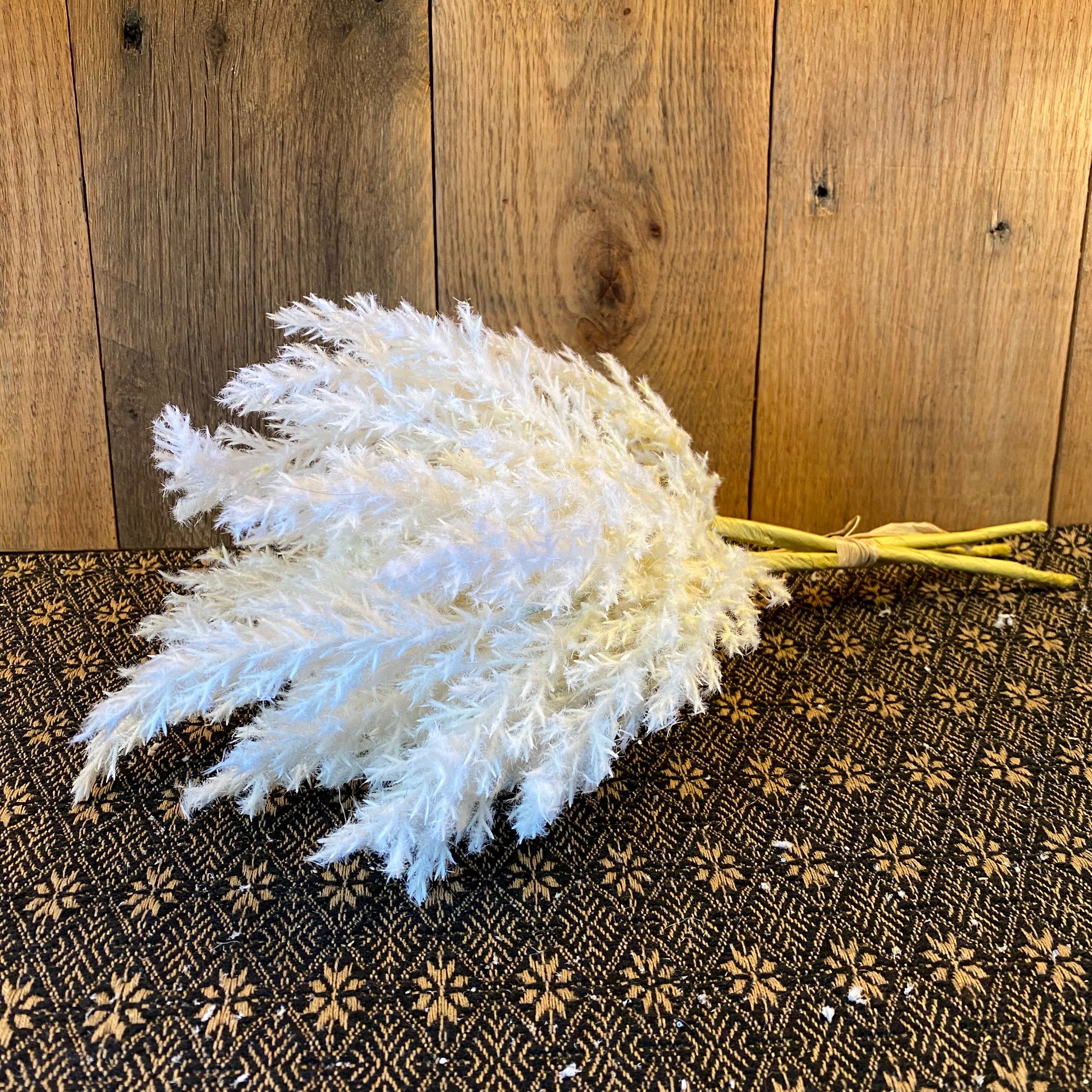 Pampas Plume branches in natural cream color. Three branches tied together, can be used together or separately. Measures 17" long x 7-8" wide.