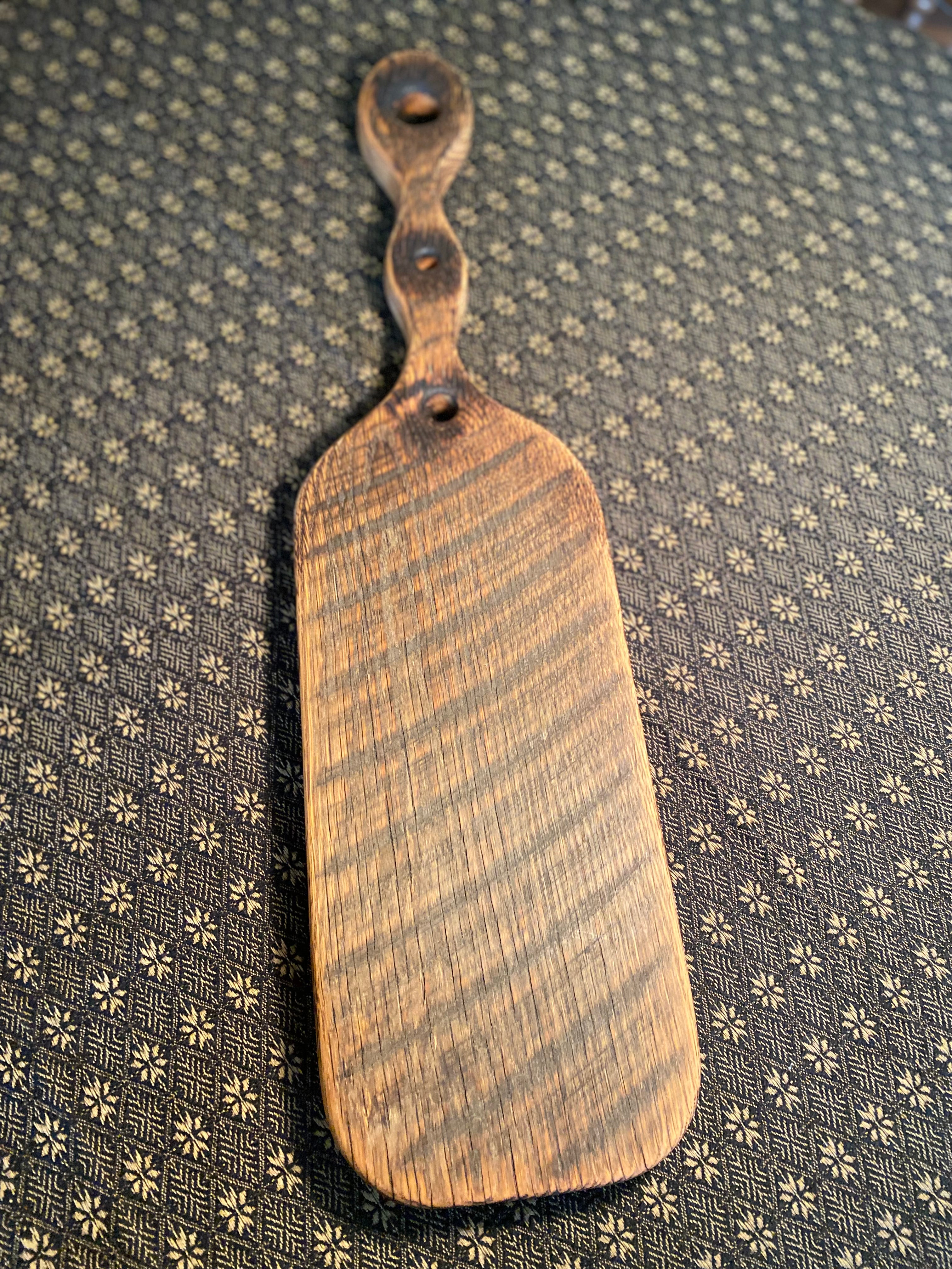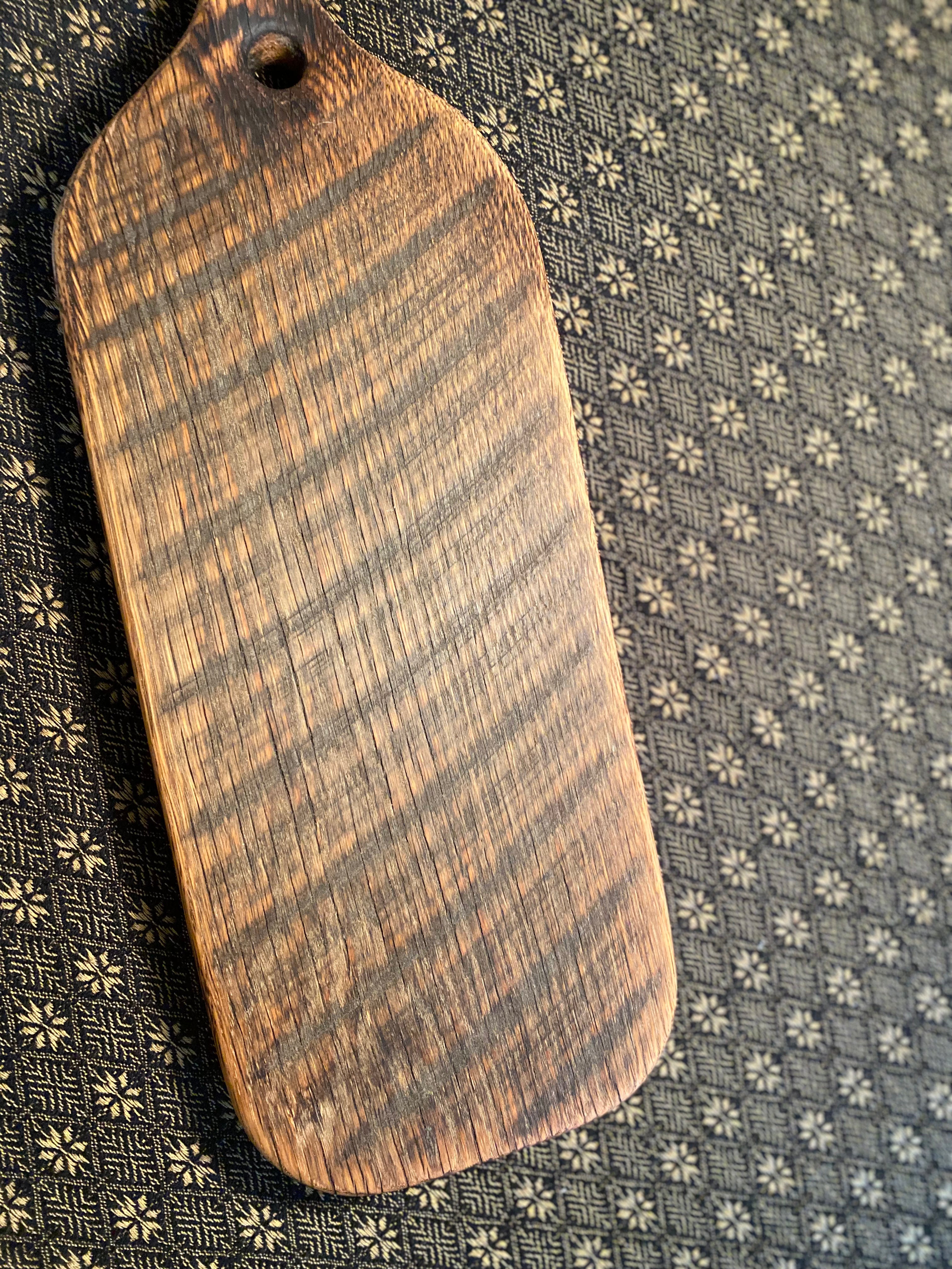 Hand crafted right here at the Tree! Made from solid oak with the circular mill cuts remaining for an authentic rustic look. Designed specifically for cuts of meat after grilling--your presentation would be amazing! However, this board could also be used for a charcuterie board as well. It is sure to be a conversation piece!!