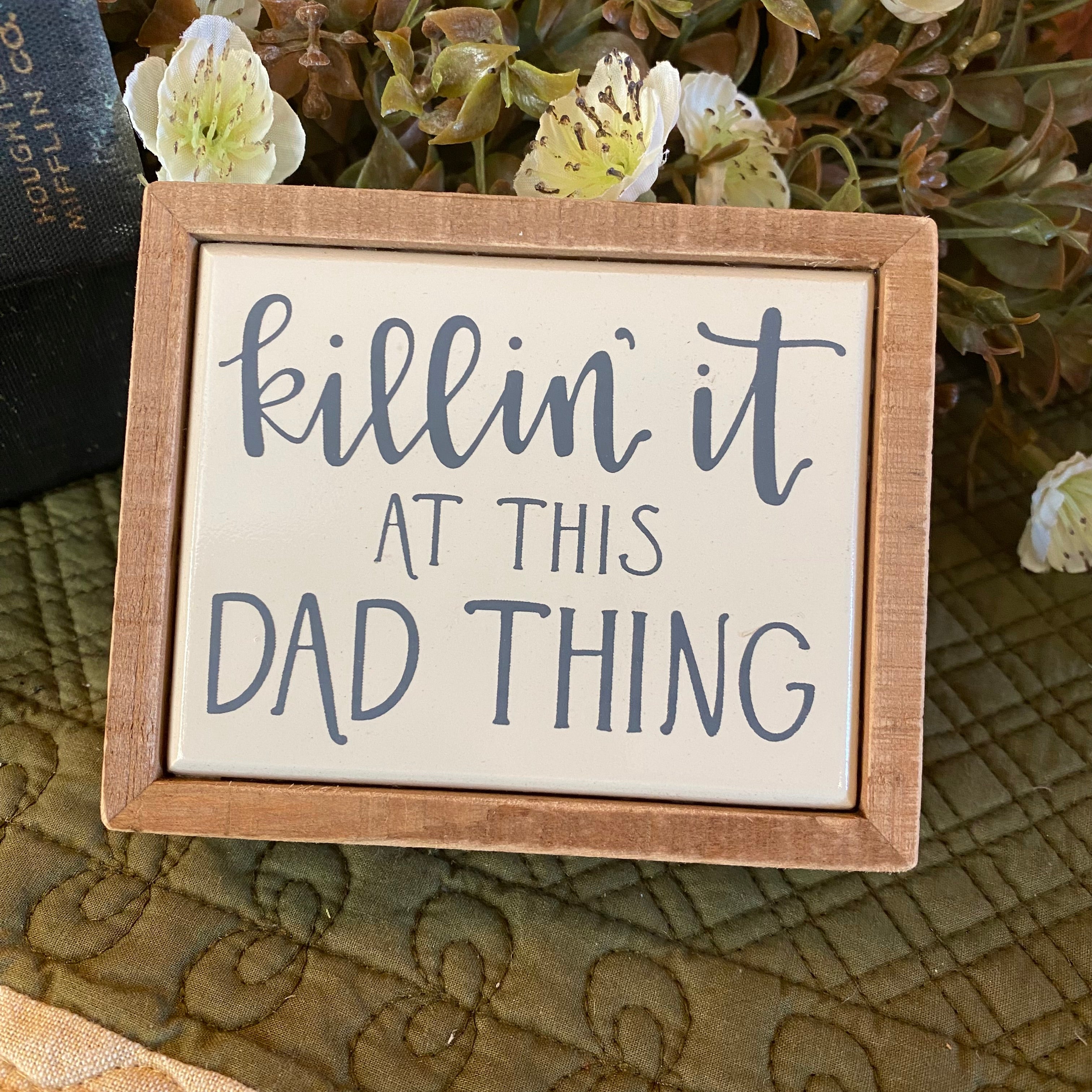 A wooden mini box sign featuring "Killin' it at this dad thing" sentiment and faux cream enamel finish for tile-like appearance. This sign is easy to hang or can free-stand alone. Perfect for a tier tray. Measuring 3" x 3.75" x 1"
