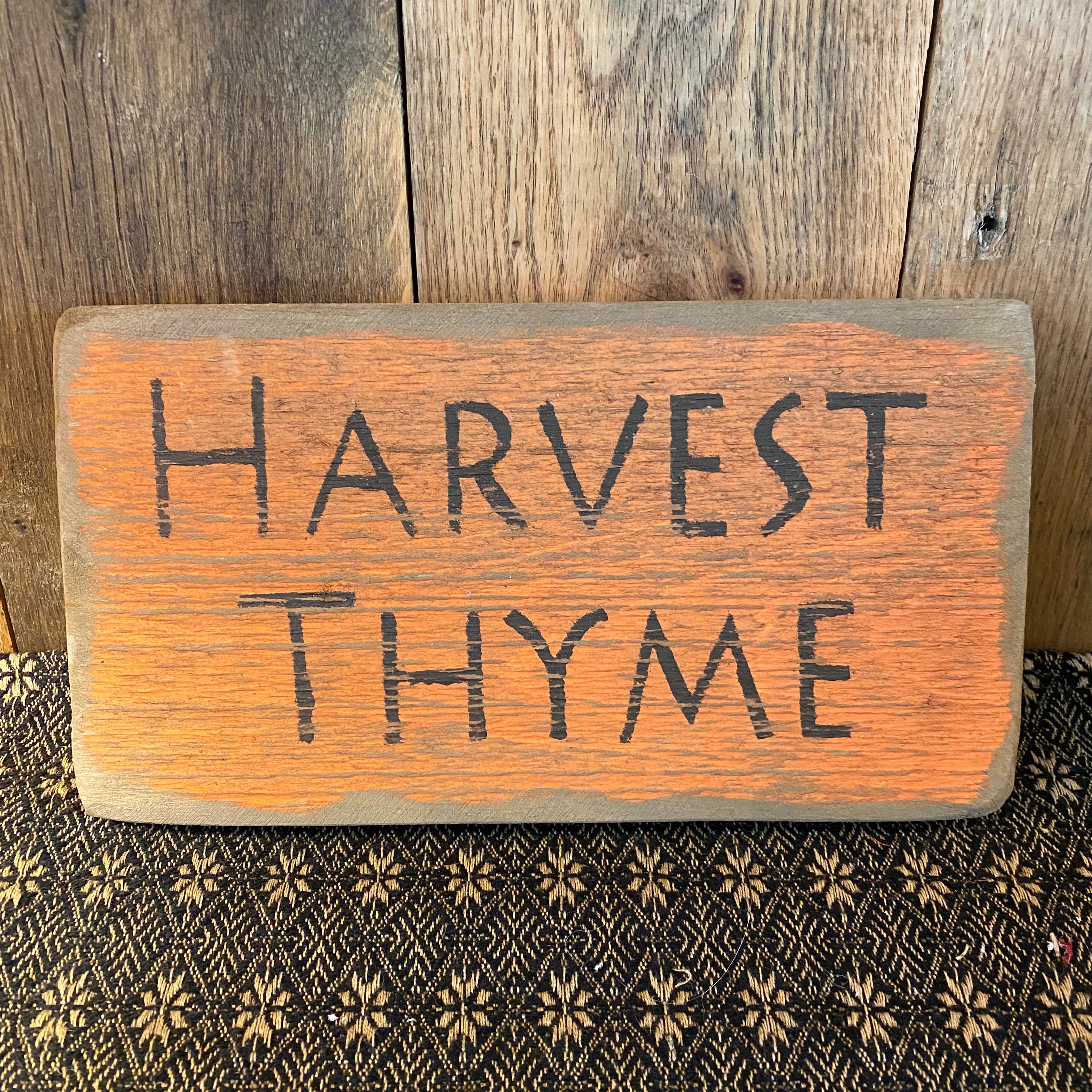 Rustic orange sign with 'Harvest Thyme" in black lettering. Hanger is attached. Measures 10x5.5"