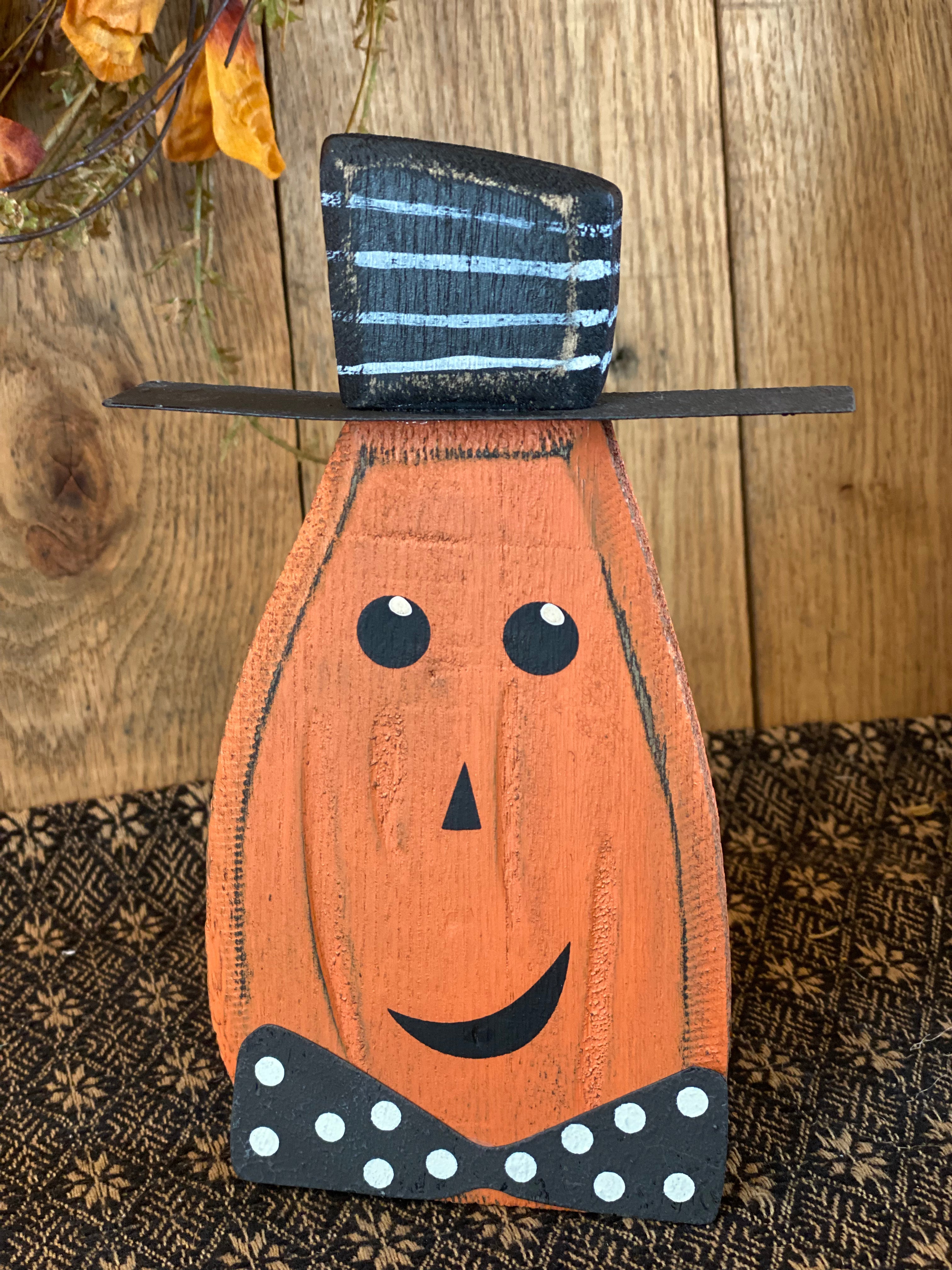 A wood sitter displaying a happy pumpkin head in traditional Halloween colors featuring distressed details. Designed to free-stand alone on a flat surface. Measures 6x8x1"
