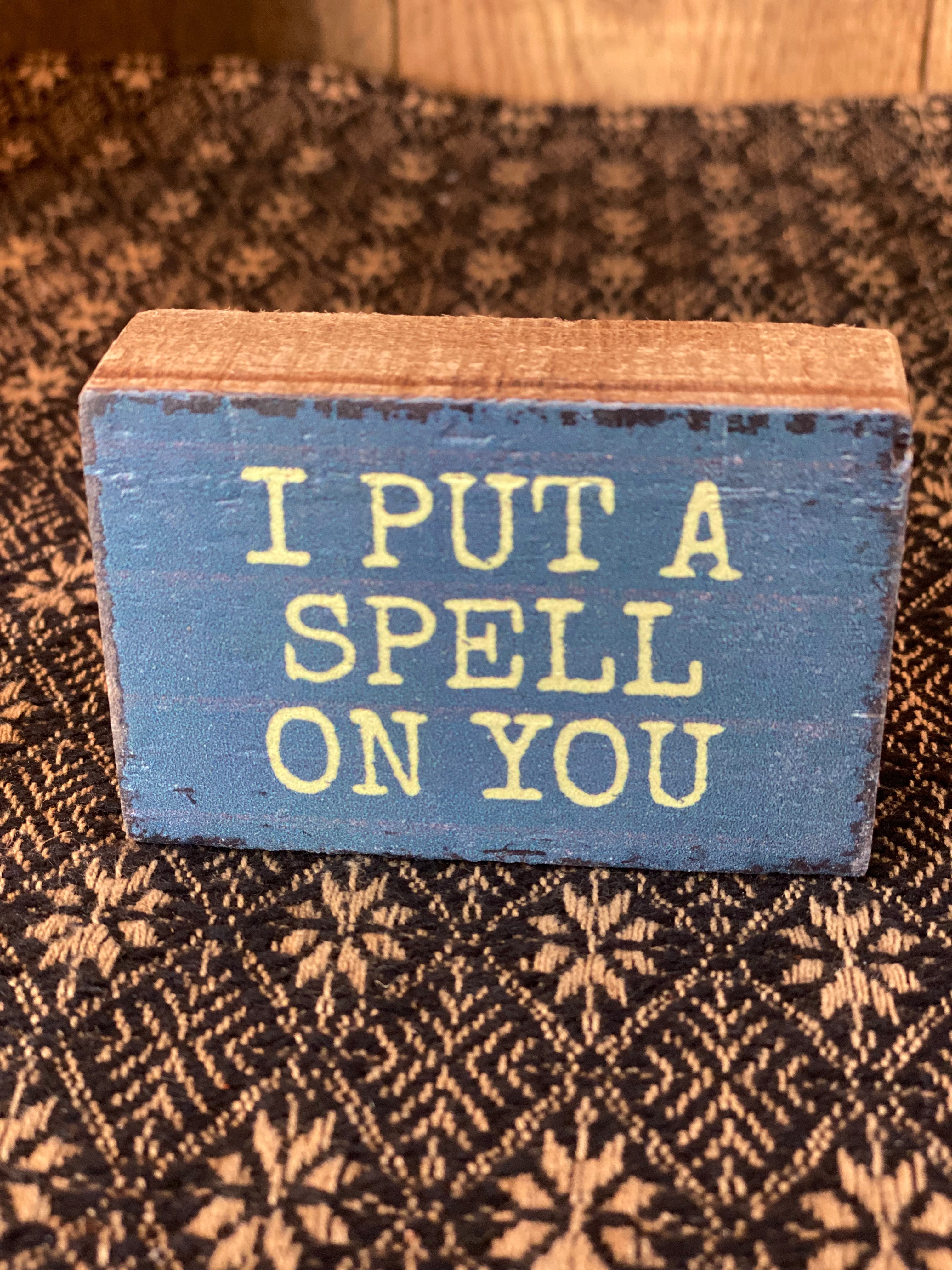 A mini wooden block sign featuring a textured background and I Put a Spell on You sentiment. Measures 3x2x1"