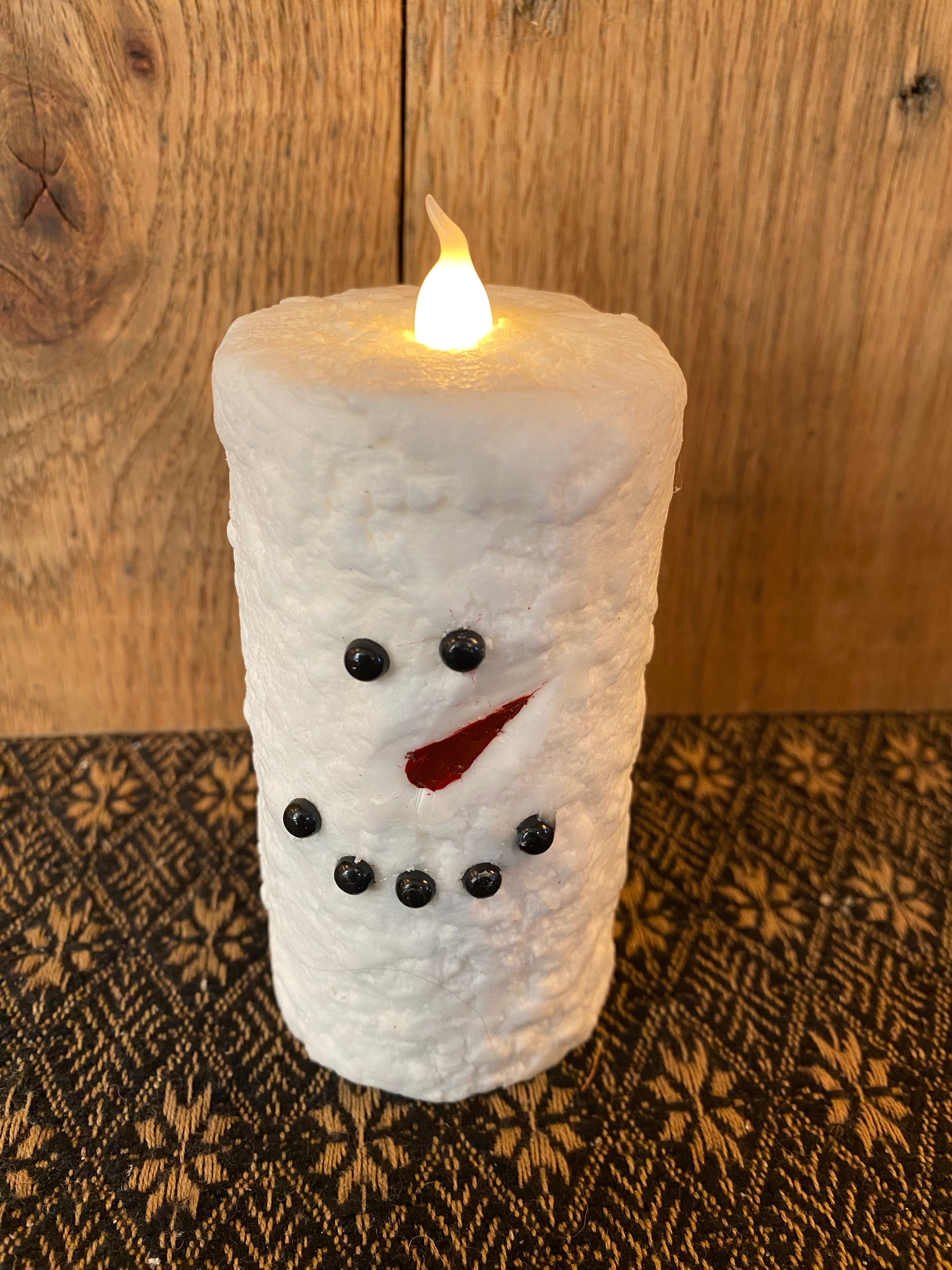 This adorable 4" pillar snowman candle comes with a convenient timer option!  Choose between a 6-hour timer (automatically turns off for 18 hours) or the "on" mode for continuous glow until you switch it off. Perfect for adding a warm, festive touch to your home this season!