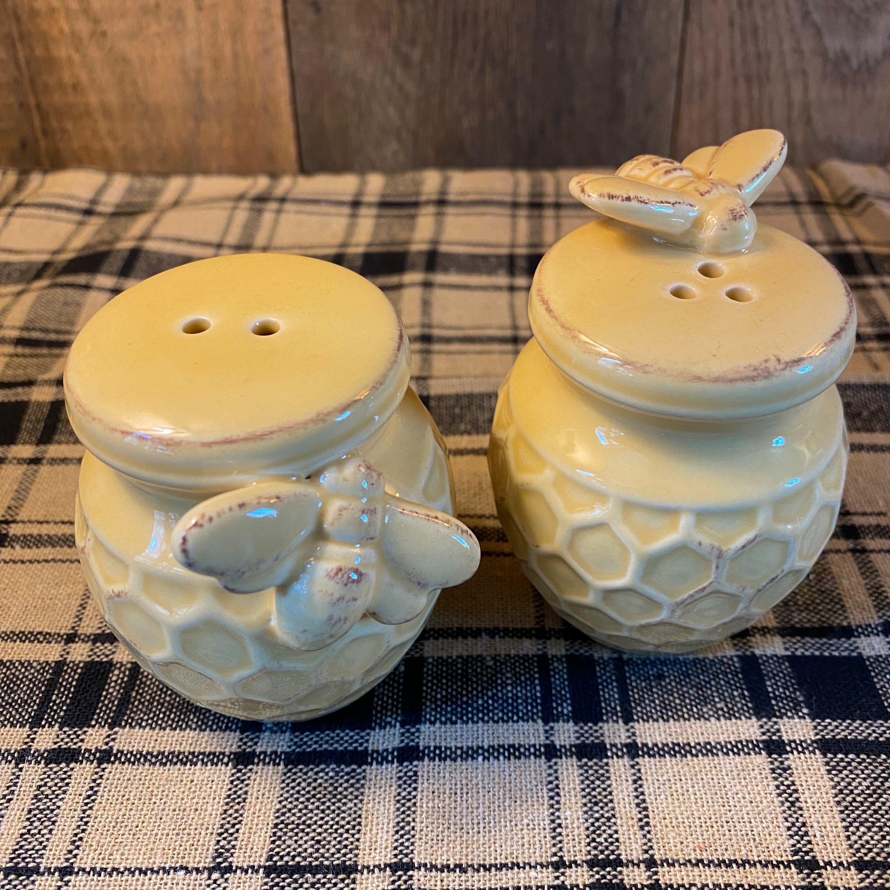 HoneyComb Salt & Pepper set in a buttery soft yellow with honeycomb and bees. Measures 3" tall by 2.5" wide each.