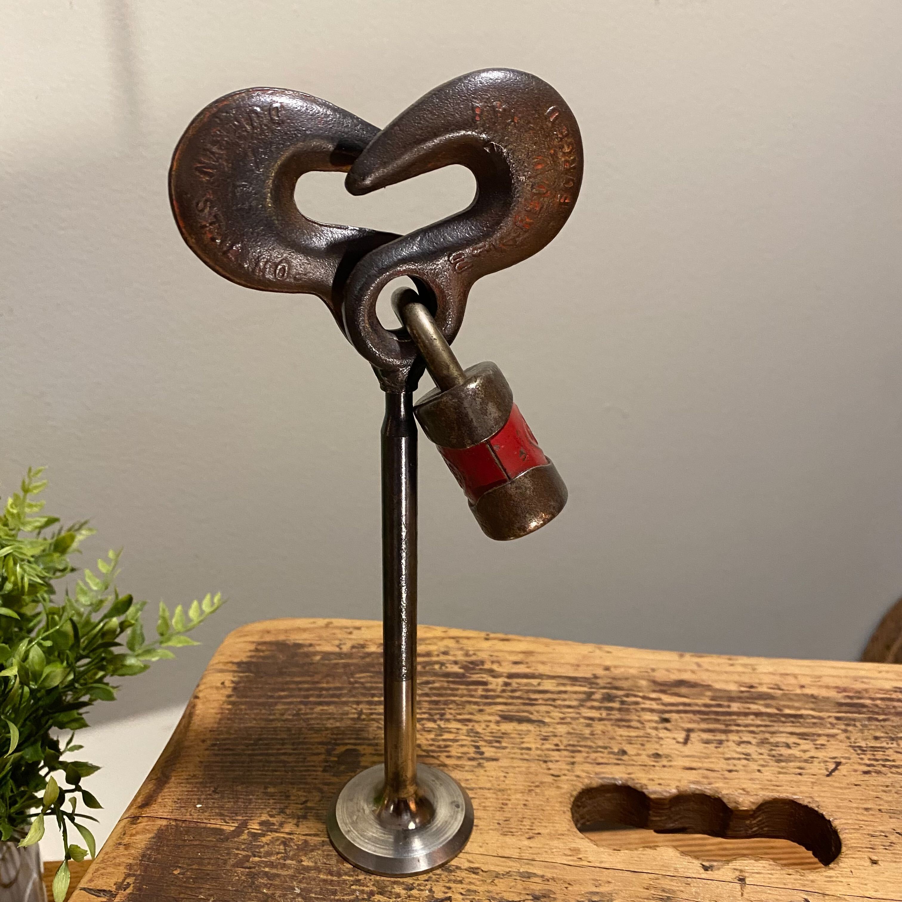 Fabricated chain hooks with vintage lock on auto valve pedestal. Measures 8" x 3.5"