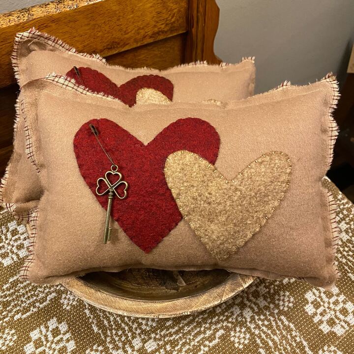 flannel fabric with coordinating fabric backing with frayed edging. Adorned with a rusty pin and key.
