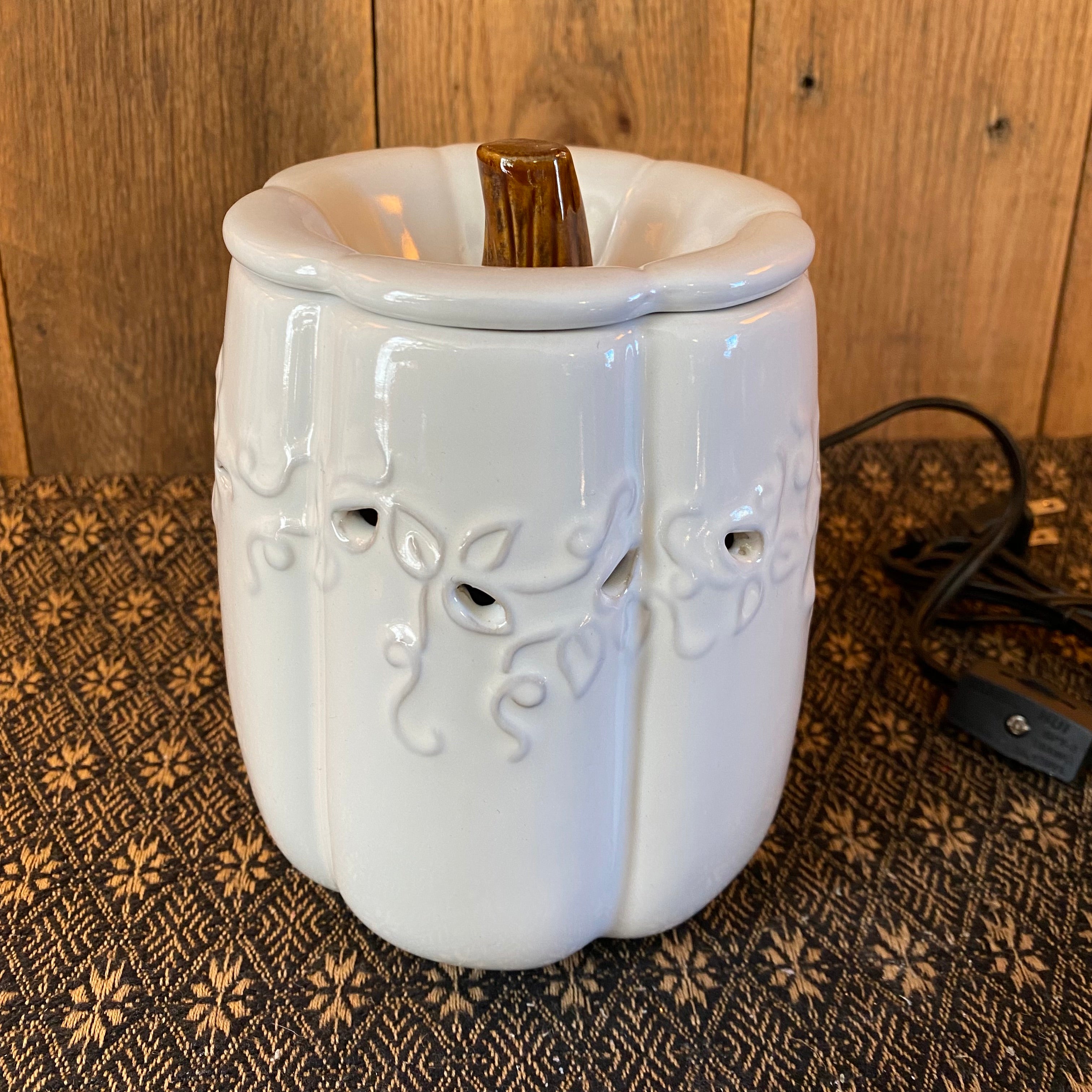 Large capacity Illumination Fragrance Warmer in a creamy white color. Designed to warm scented wax, creating a relaxing glow and ambiance while releasing your favorite fragrance. Removable dish to allow for easy cleaning. No flame, no smoke and no soot. Electric cord with easy on/off switch.