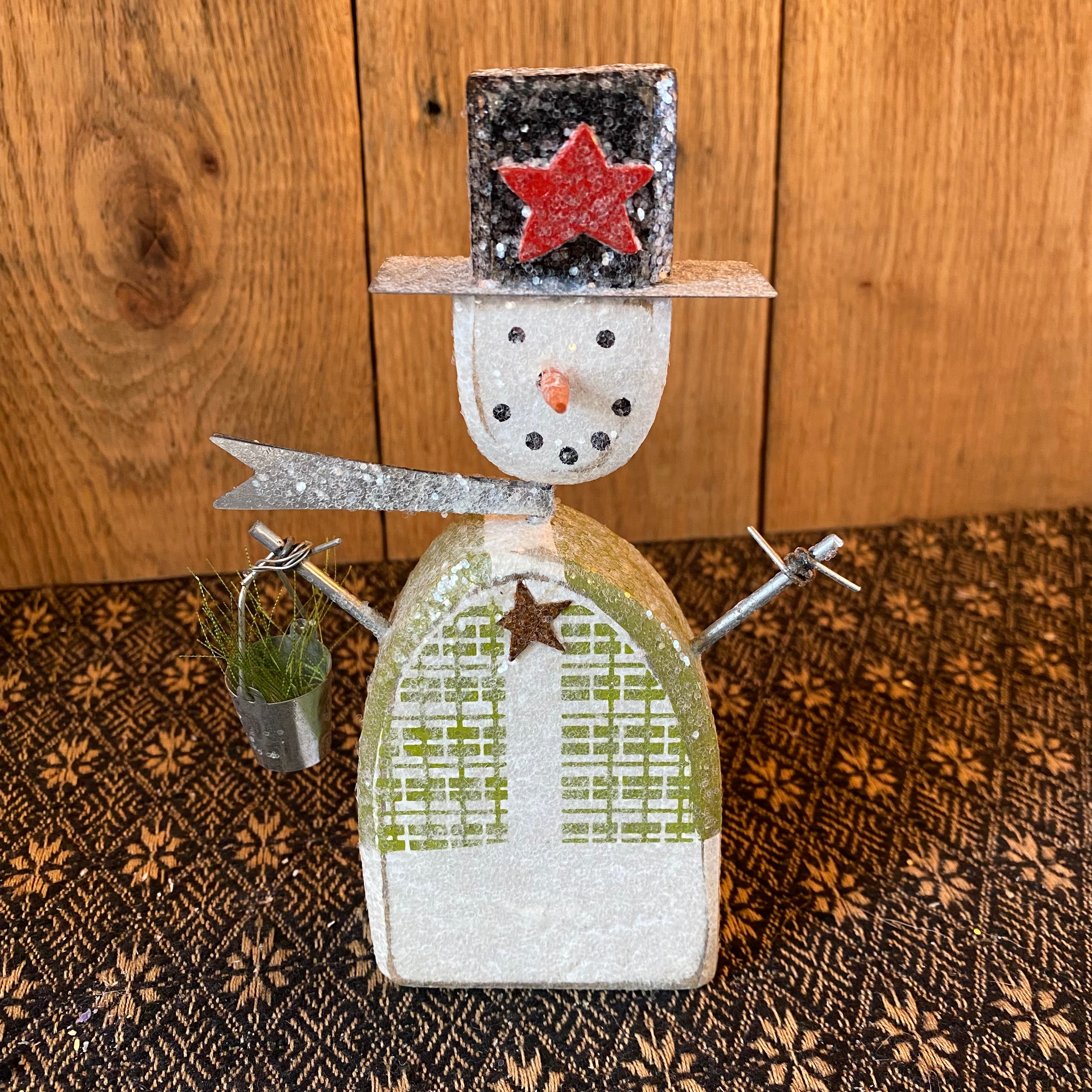 A wooden chunky sitter in a snowman silhouette featuring a metal scarf, hat, bucket and arm details.