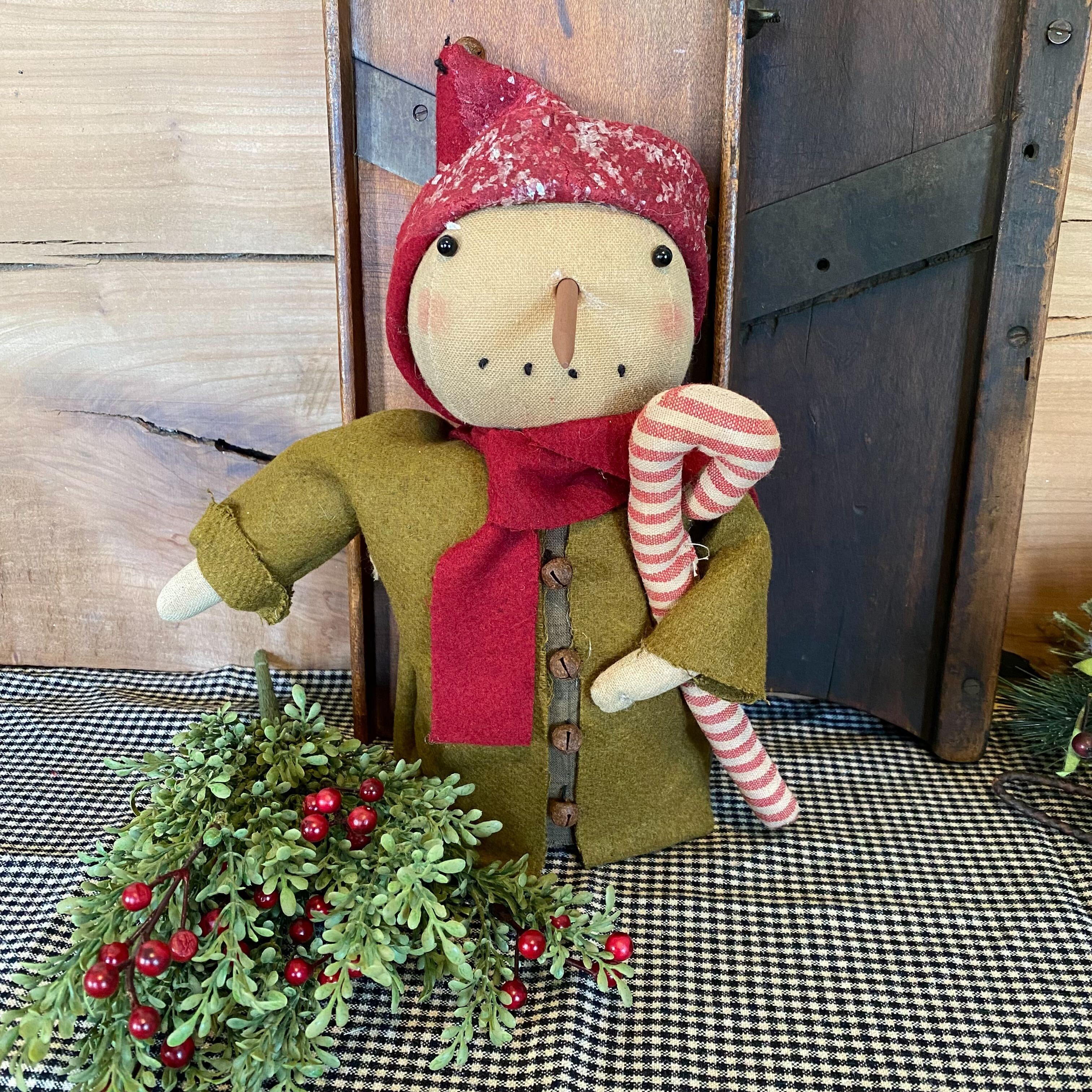 carrot-like nose, rusty wool 'jingle bells' for buttons holding a candy cane.