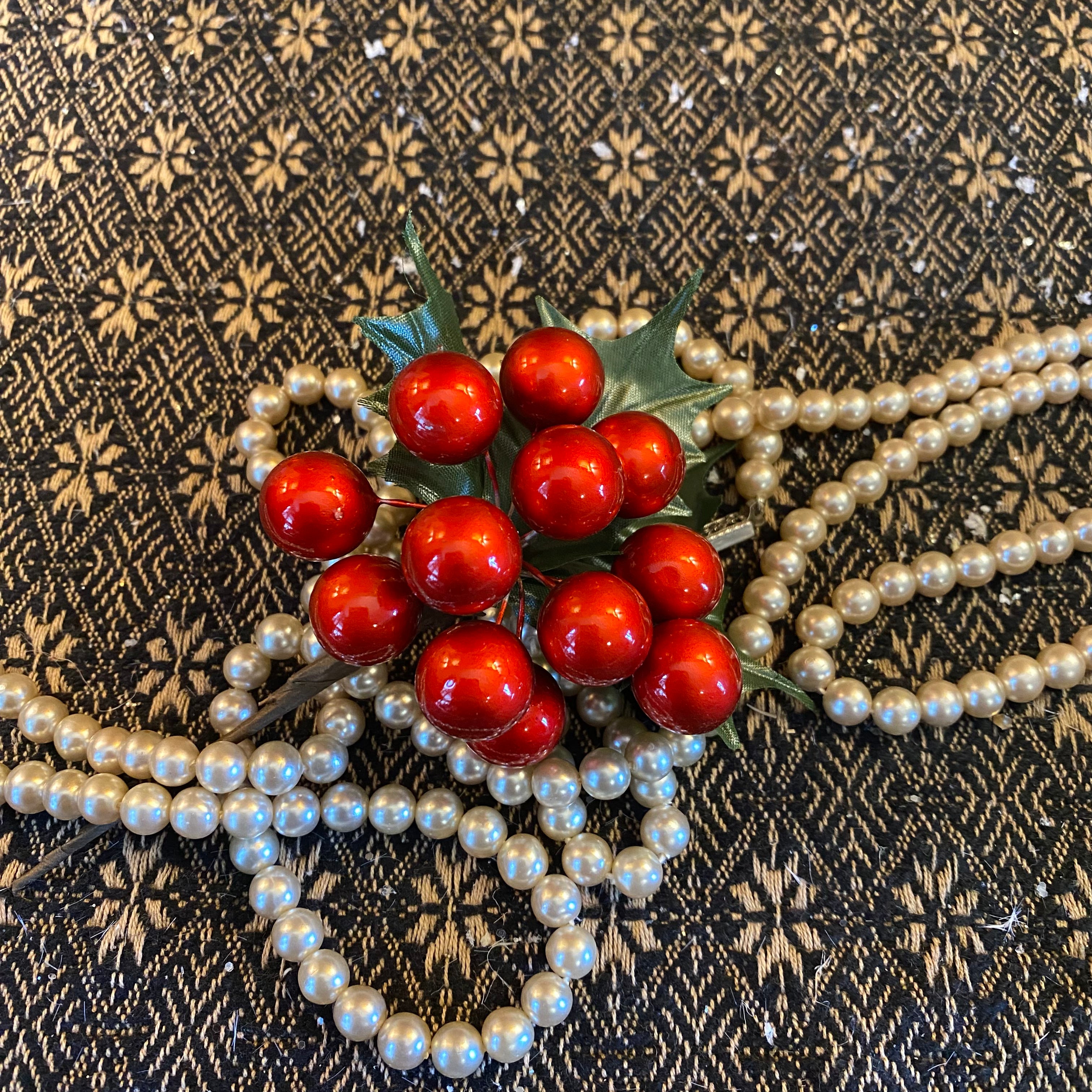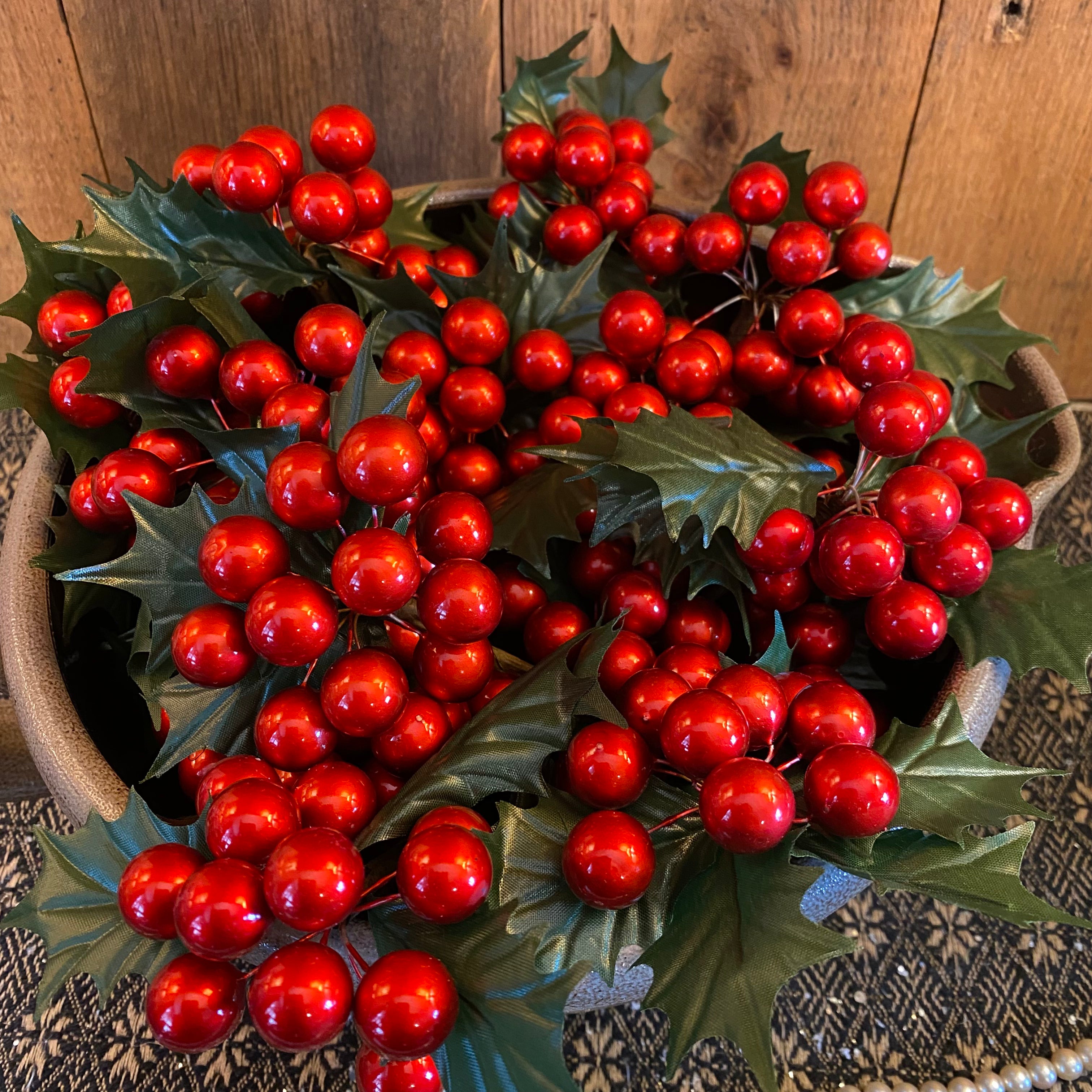 Small red holly berry pick is the perfect little pop of red color you need to put in bowls, on shelves, mantels, tablescapes and more. This small pick has several large red berries and holly leaves.